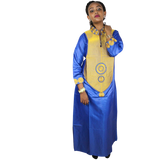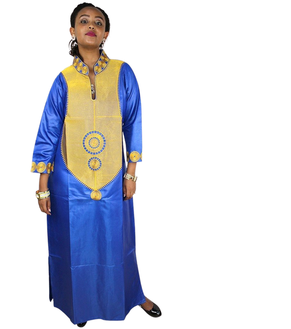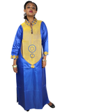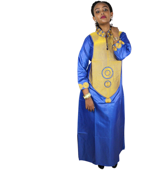 Como el cielo de verano, sé radiante en este Boubou Mujer Africana Azul . La riqueza de los bordados dorados realza el resplandor de tu cielo como un sol africano.